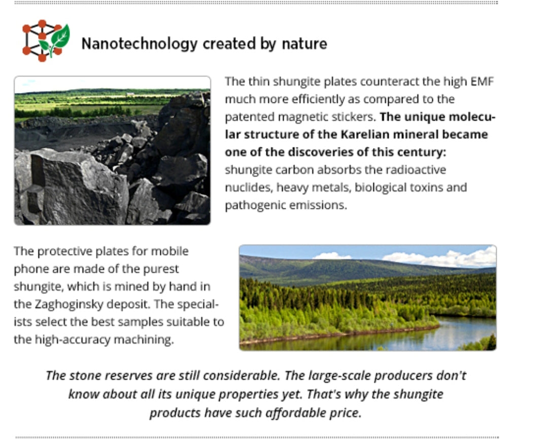Shungite is considered an excellent source of protection from harmful electromagnetic radiation from computers, microwave ovens, TV sets, mobile phones, ect.